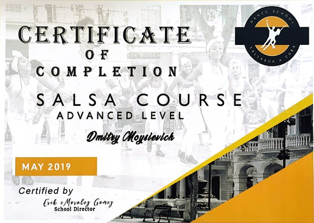 4. Сертификат прохождения повышенного уровня по курсу "Сальса" в школе танцев "Salsabor a Cuba".